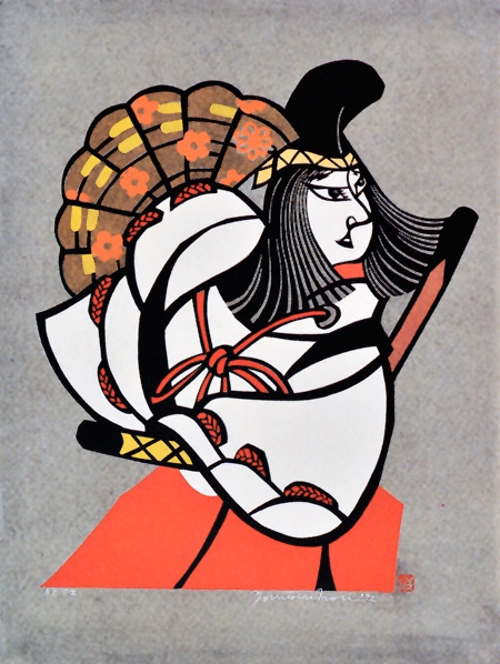 1972 70.0×52.0 祇王の舞 ed.50森義利作品の大多数の作品は、合羽摺りという技法によって摺られています。数枚の薄い和紙を柿渋で塗り、張り合わせて仕上げた強靭な渋紙に描画し、作品の最後の仕上げに墨色で輪郭をつけて摺る「骨線摺り」を多用した技法です。